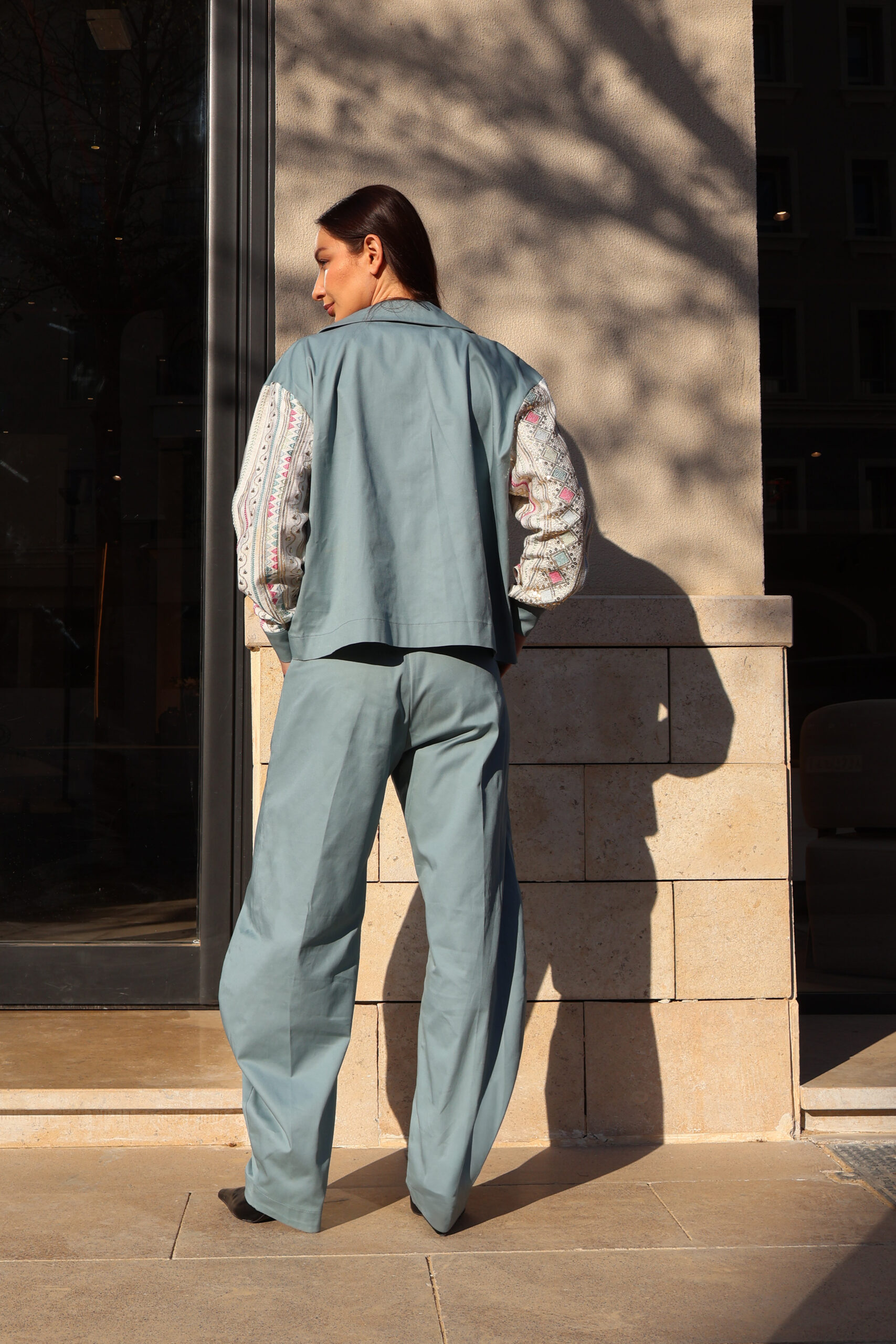 • Matching dusty blue gabardine fabric