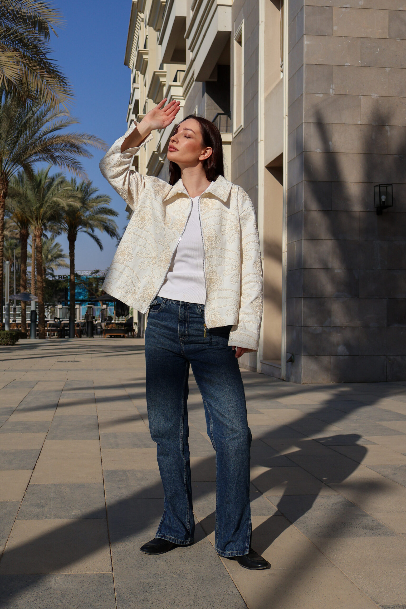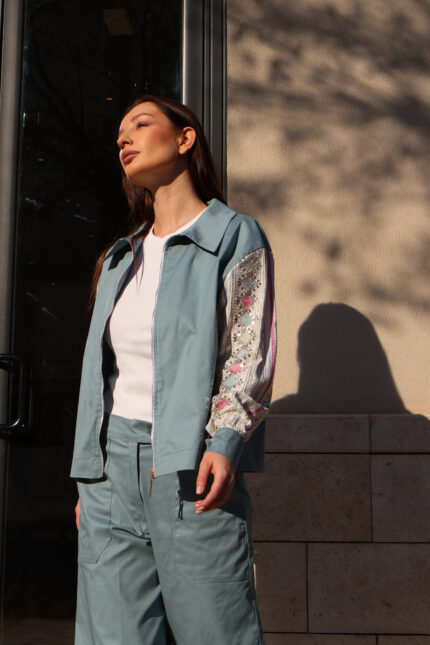 • Full beige embroidery across the jacket