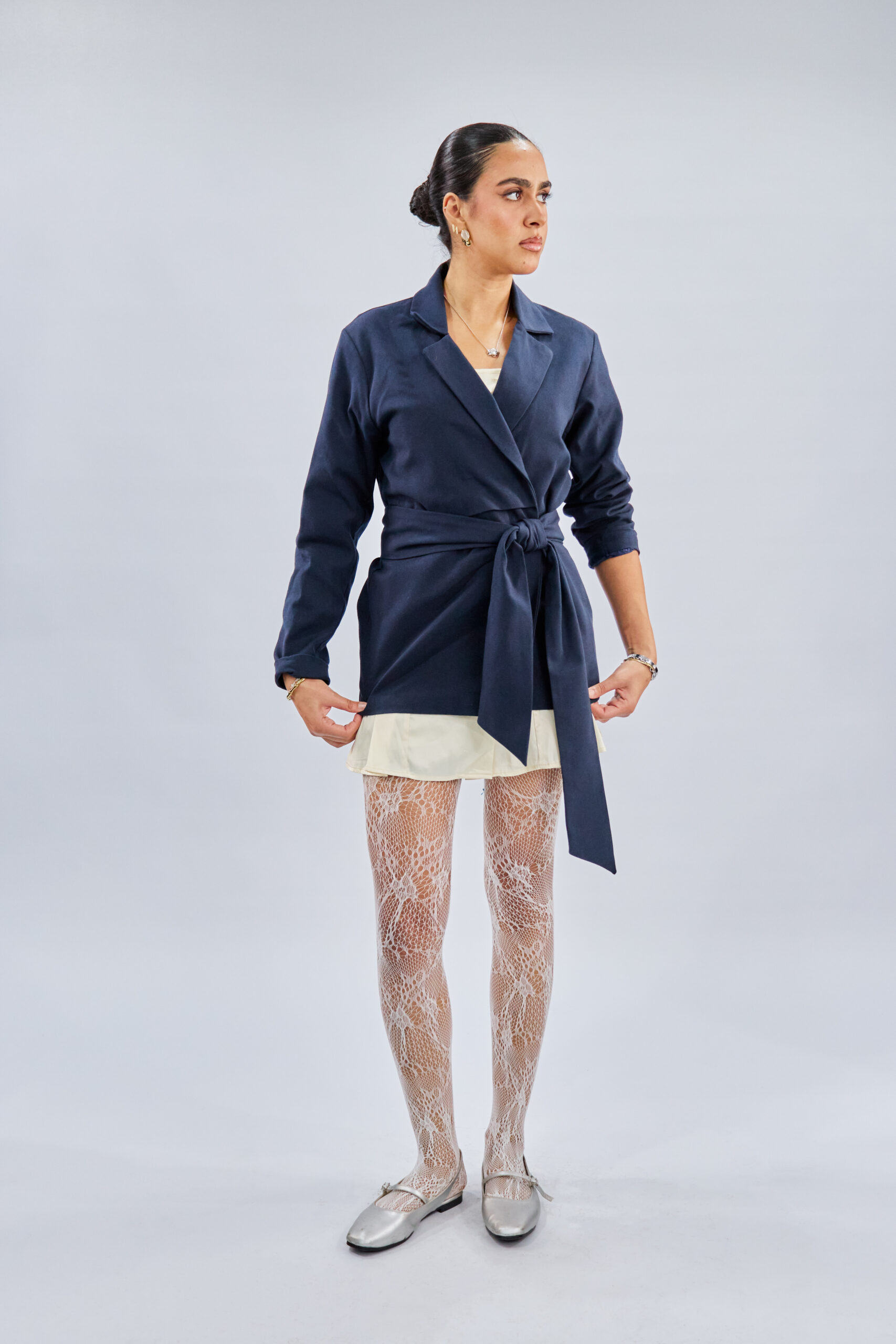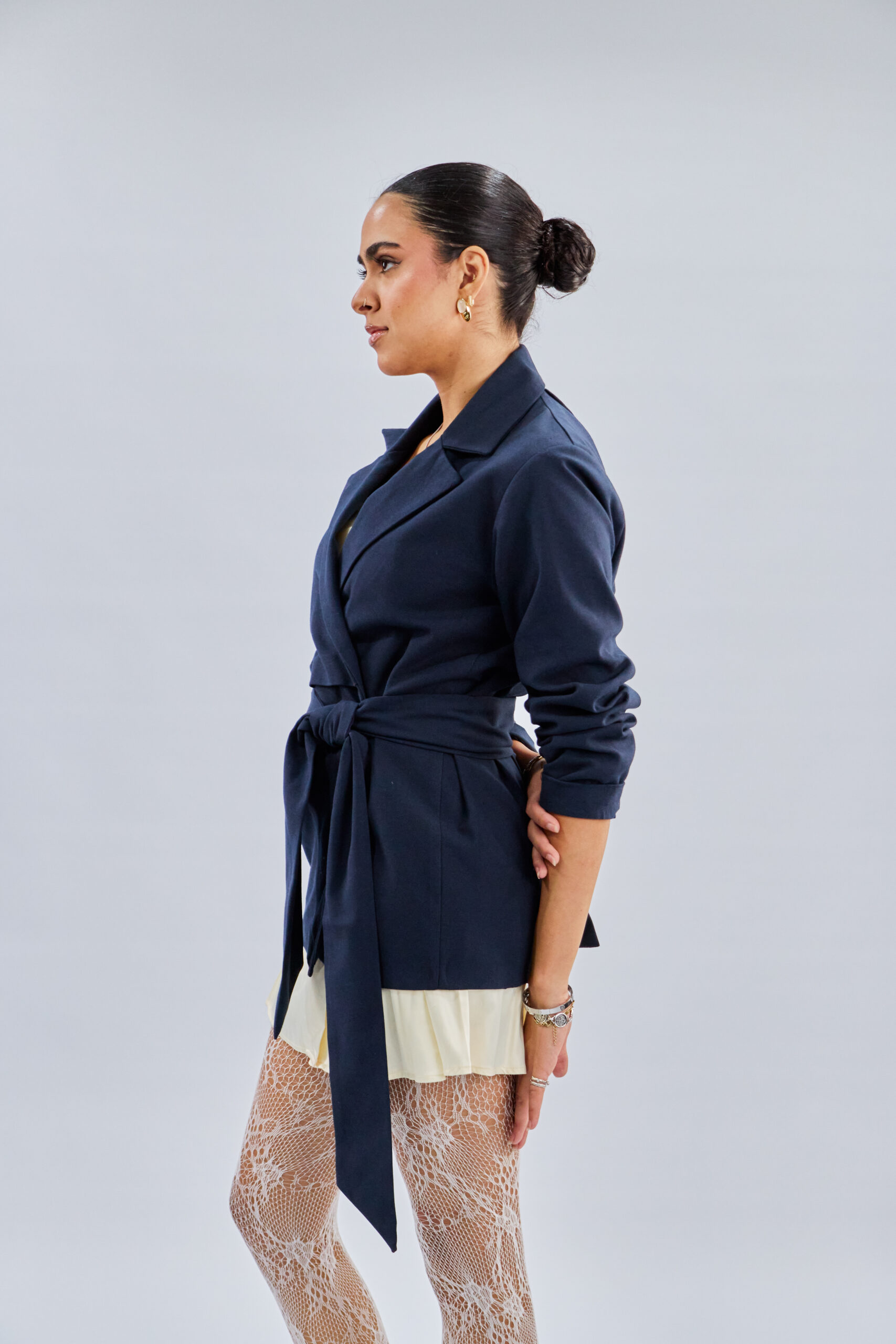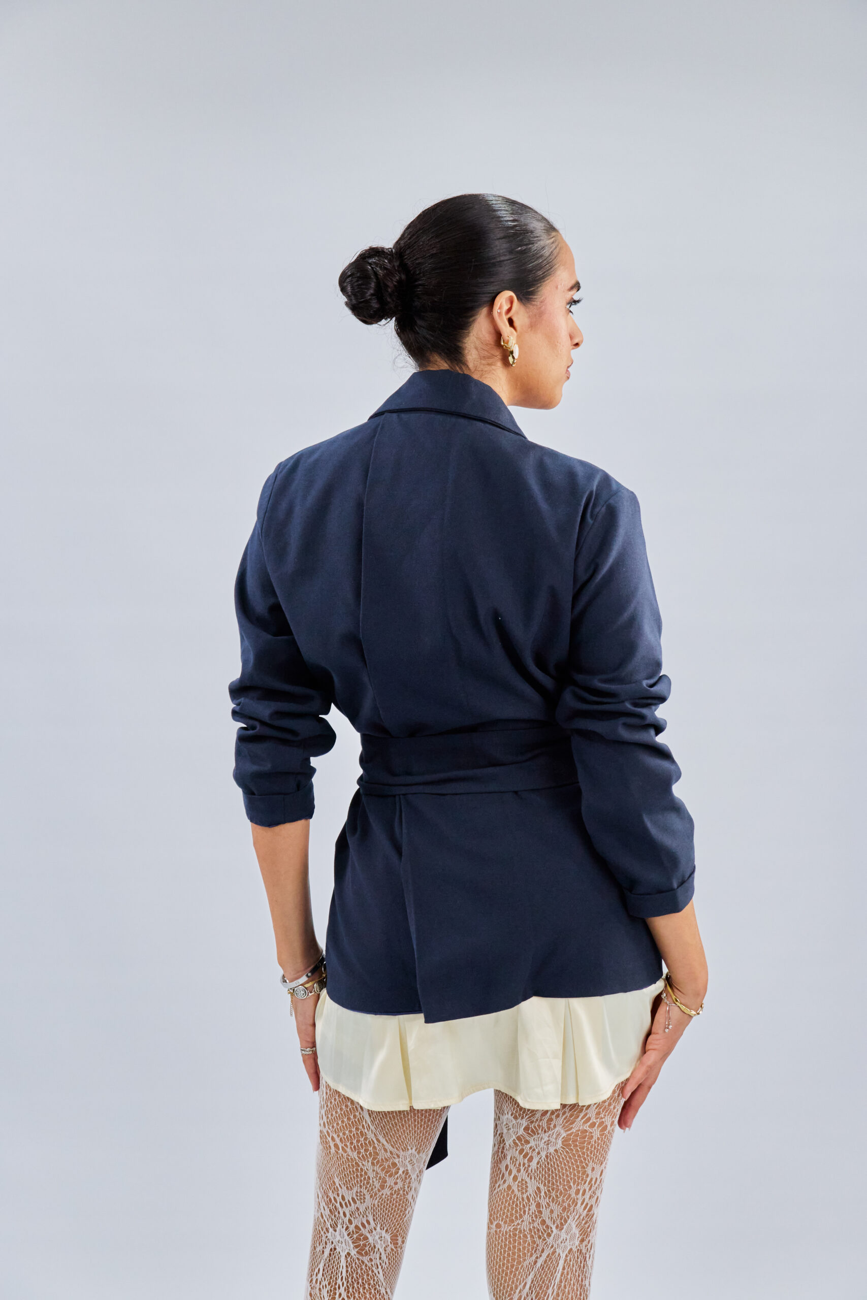 A structured statement blazer designed with a sleek waist-defining belt for a polished, modern silhouette.