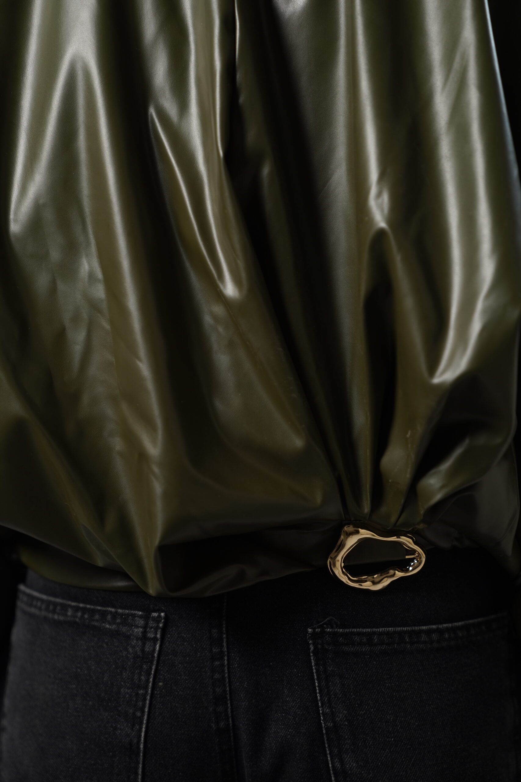 A statement leather jacket designed to stand out. Crafted in olive green leather and elevated with luxurious gold