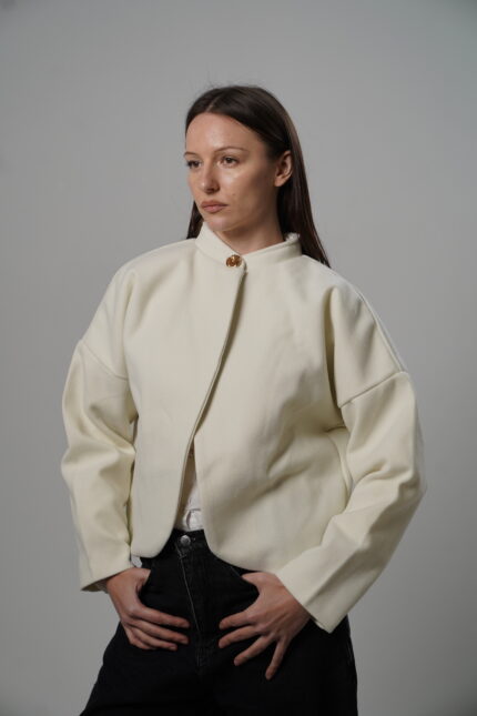 appliqué detailing on the back, this piece balances strength and elegance. A bold outerwear choice that transforms